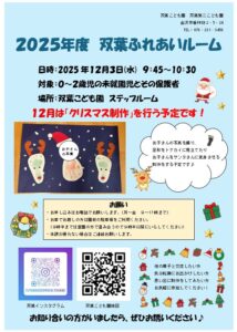 子育て支援ふれあいルーム12月はクリスマスの製作をします♪未就園児のご参加お待ちしています(^▽^)