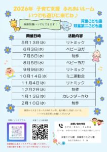 2026.04.16 お知らせ 2026年度 子育て支援『ふれあいルーム」年間予定 子育て支援「ふれあいルーム」を月に一回実施しています。未就園児の方のご参加お待ちしています。お問合せ、お申込みは、双葉こども園(076-231-3456)」まで、お願いします。